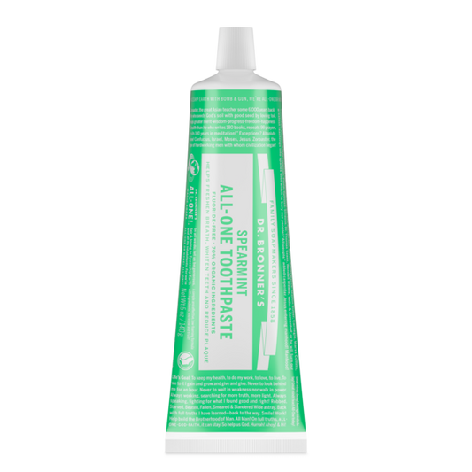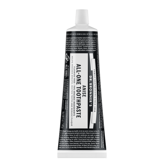 Introducing Dr. Bronner's All-One Toothpaste with 70% organic ingredients! Our low-foaming formula has no synthetic detergent foaming agents, is fluoride-free, vegan and cruelty-free, with no artificial colors, flavors, preservatives, or sweeteners & none! This simple yet effective toothpaste stimulates mouth, teeth, gums and tongue, leaving them fresh and clean. Made in a 100% recyclable box and tube. Available in peppermint, spearmint, cinnamon and anise flavors.